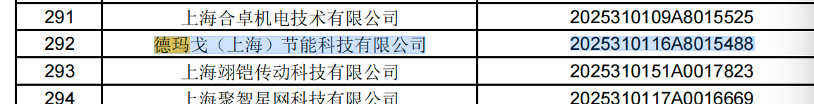 A kiválasztott cégek között Demargo (Sanghaj) Energy Saving Technology Co., Ltd. sikeresen felkerült a listára a regisztrációs kóddal 2025310116A8015488 .