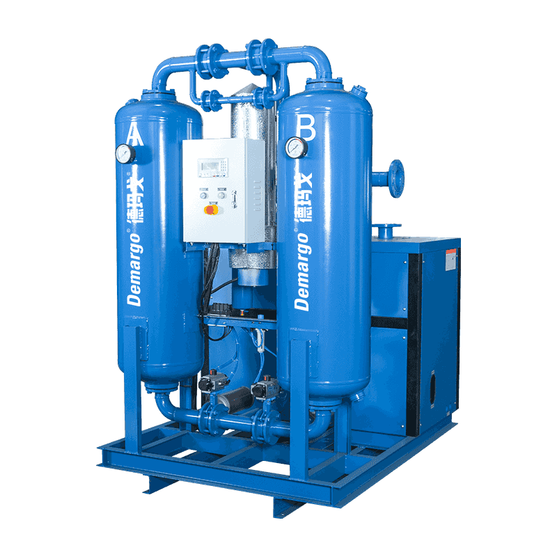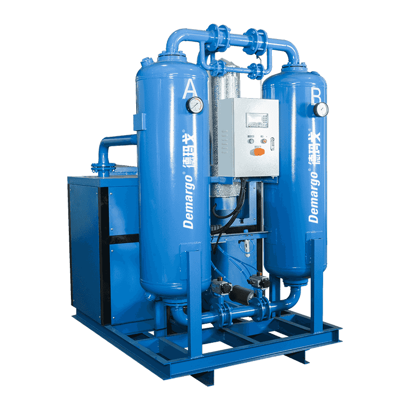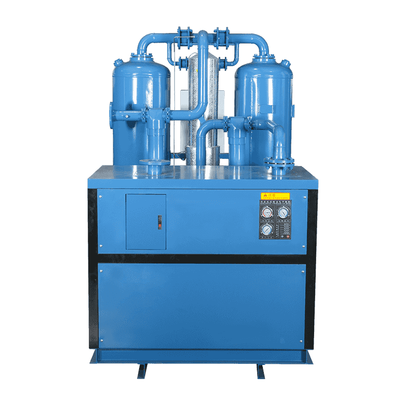 A sűrített levegőben a víz, az olaj és az egyes szennyeződések nagy részét itt kondenzálják, és a levegő és a vízgőzt a gázvíz elválasztó választja el. A vizet és az olajat az automatikus csatornán keresztül ürítik. A sűrített levegő a fagyasztás utáni szárítás után belép az adszorpciós toronyba. A sűrített levegőt mélyen adszorbeálják, és a nyomásviszony -adszorpció elvével szárítják, amíg a harmatpont hőmérséklete nem felel meg a követelményeknek. Az adszorpciós toronyból kifelé érkező száraz, sűrített levegő visszatér az elülsőbe, hogy lehűtse a forró és nedves sűrített levegőt a légkompresszorból, hogy a saját hőmérséklete megnövelje. A fűtött, száraz sűrített levegő szintén megakadályozhatja a kondenzációt a szállítóvezetékben. A szárító regenerációs levegője a szárító levegő kimeneti nyílásából származó száraz, hőlény levegő, amelyet a fűtőberendezés melegít. Ezért az adszorbens rövidebb idő alatt regenerálható, nagyon kevés regenerációs gázfogyasztással. A mikrovászat kombinált szárítójának folyamatáramlását a 2. ábra mutatja. A sűrített levegő először belép az elülsőbe, hogy hőt cseréljen a szárítóból a száraz sűrített levegővel, így a száraz sűrített levegő hőmérséklete növekszik, és ugyanakkor a sűrített levegő hőmérséklete a párologtatóba való belépés előtt csökkent, és a víz egy részét eltávolítják a szobahőmérsékleten történő csökkentéshez. Ezután belép a párologtatóba a hűtés, a hűtés és a páratlanítás céljából, így a sűrített levegőt kb. 5 ° C -ra lehűtik.