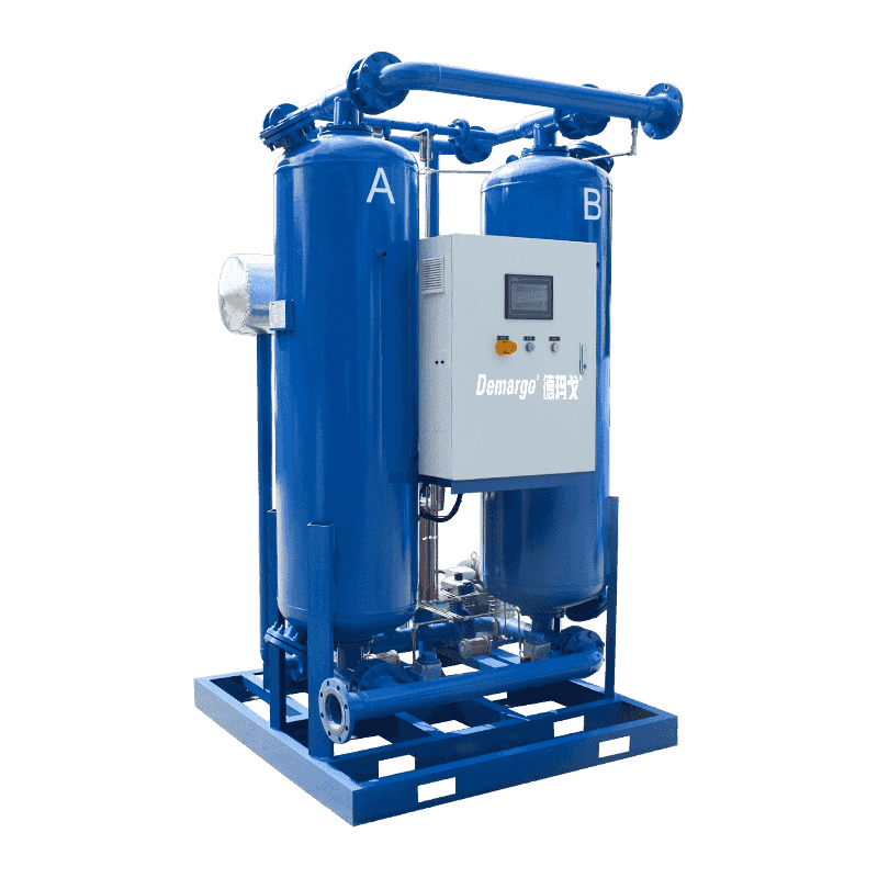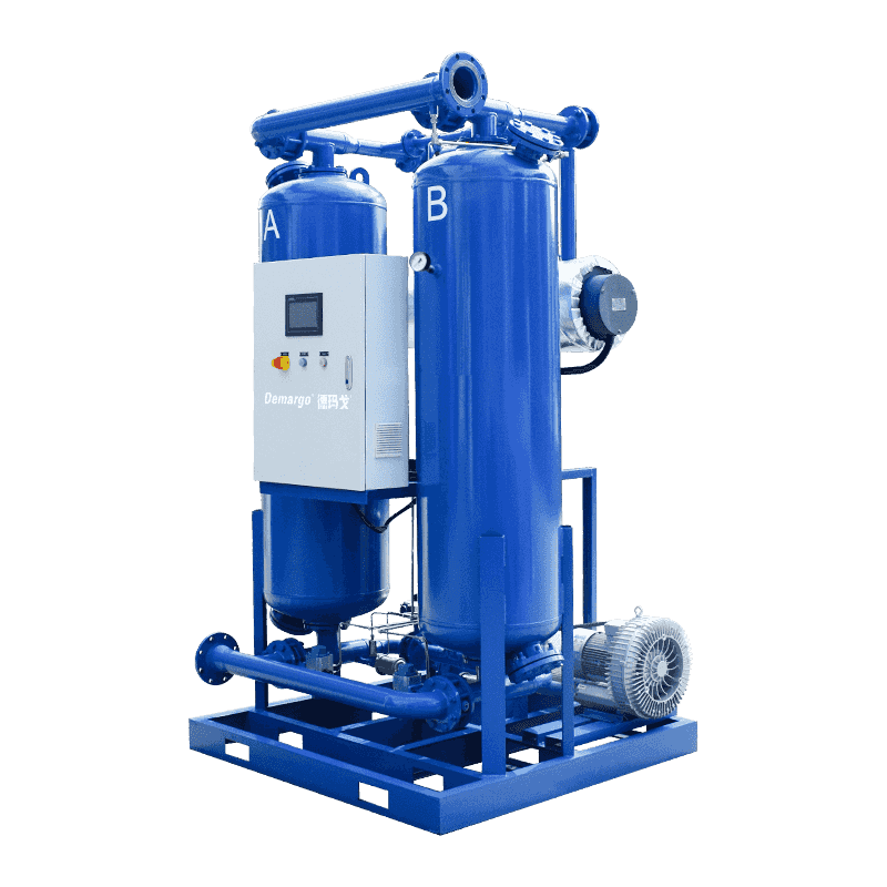 Az alacsony gázfogyasztási robbantási hő regenerációs adszorpciós szárító teljes munkaköri folyamata négy szakaszból áll: adszorpció, regeneráció, hideg fújás és nyomás kiegyenlítése. Az alacsony gáz-fogyasztású robbantási hő regenerációs adszorpciós szárító eljárása nemcsak az egyes szelepek működési sorrendjének rendszeres váltását igényli, hanem a fűtési hőmérséklet szabályozását is. Ha a hőmérséklet túl alacsony, akkor az adszorbens nem dezoredálható; Ha a hőmérséklet túl magas, az adszorbens hajlamos a romlásra.