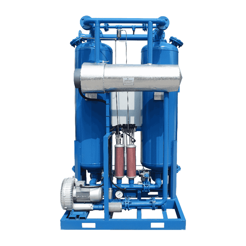 Az alacsony gázfogyasztási robbantási hő regenerációs adszorpciós szárító a fűtési regenerációs szárítóhoz tartozik. Munka alapelve az, hogy egy ventilátort használ a környezeti levegő kinyerésére, majd a fűtés után az adszorpciós toronyban a szárítószer regenerálására, elkerülve a mikrovenerációs adszorpciós szárító gázvesztését a fűtési szakaszban. A hidegfúvó szakasz a kész gáz részének helyett a hűtés utáni hűtést használja, így a legnagyobb mértékben energiát takaríthat meg. Ez egy adszorpciós szárító, amelynek "energiamegtakarítás és emissziós csökkentés" hatás, amely megfelel az országom nemzeti politikájának. A fűtési regenerációs szárító regenerációs energiafogyasztásának két formája van, az első az, hogy az adszorbens eléréséhez szükséges hőkenergia, amely eléri a deszorpciós hőmérsékletet, és párologtatja a vizet, a második pedig a hőkőként és a hűtő tápközegként használt gáz. A robbantási fűtési regenerációs szárítóban, mivel a környezeti levegőt hőtartóként használják, a sűrített levegőfogyasztás jelentősen csökken.