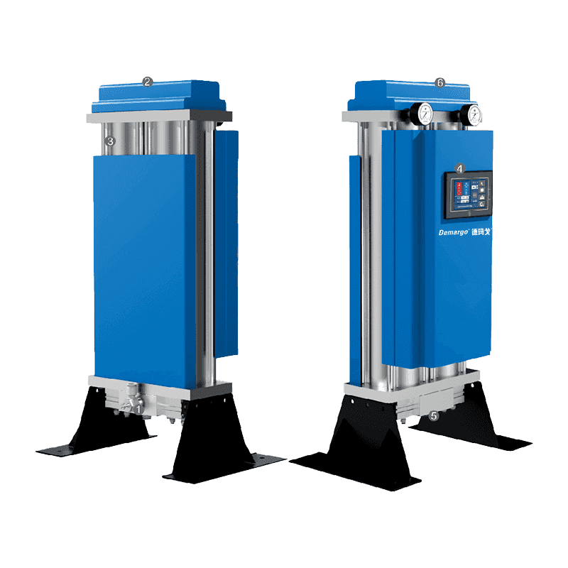 7. Az adszorbens molekuláris szitát használ a kimenet sűrített levegő harmatpontjának stabilitásának biztosítására.